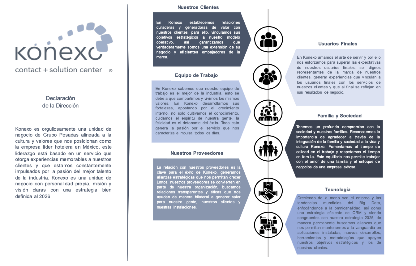 En Konexo somos un Centro de Contacto/BPS y KPS comprometido con los objetivos estratégicos de nuestros socios de negocio, a través de la atención personalizada a sus clientes, operando con soluciones innovadoras y propuestas de valor sustentadas en el análisis de información derivado del servicio ofrecido en instalaciones de nivel mundial